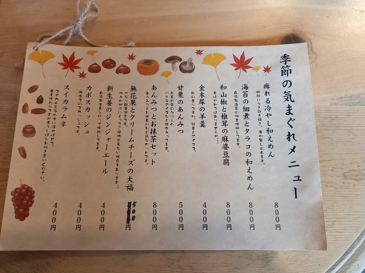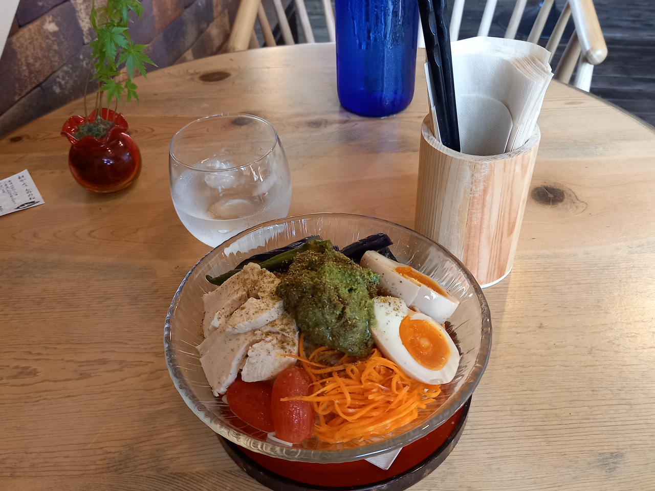 仙台市内で名取市との境付近、旧国道4号線からちょっと西側に入った所にあります。1階が音楽スタジオで2階がカフェになっています。和かふえでオシャレなお店なので、お客さんは女性がほとんどでした。食事は山椒のカレーや炊き込みご飯などの他に、季節の気まぐれメニューがあります。行った時はまだ夏向きメニューやってました。今回はその中から、痺れる冷やし和え麺800円(大盛100円増し)をいただきました。そうめんに緑のディップがど~んと乗っています。こんなにと思いましたが、痺れはきつくはなかったです。痺れ無しにも出きるので苦手な人はそちらをどうぞ。