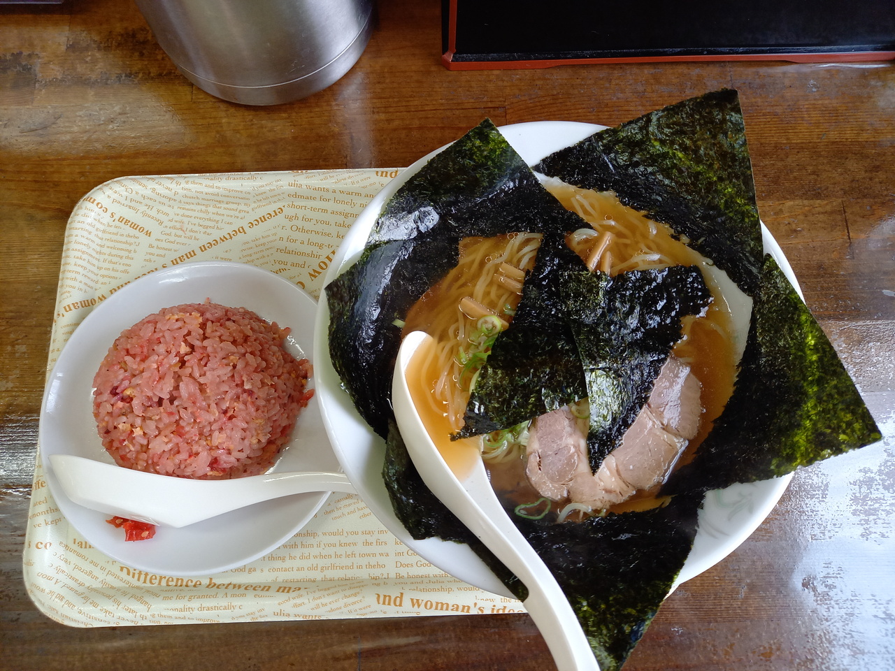 太子堂駅からは南で、ちょっと離れた住宅街にあります。赤いチャーハンで有名な町中華のお店です。はじてめの来店だったので赤いチャーハンは必須だけど、それだけではちょっと足りないと思い、セットメニューでのりラーメンセット850円をいただきました。注文から直ぐの出来上がり手際が良くて嬉しかったです。赤いチャーハンの正体は食紅でしたが、多くを主張しなく良かったです。ラーメンは、シンプルで良い味でした。
