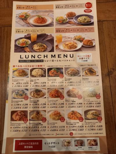 イオンモール名取店の1階にあります。生パスタをいただけます。平日はサラダやパン、ドリンクの付くランチのセットが4種類ある他、中には麺の種類を幅広平麺のフィットチーネに変更できます。今回は、フレッシュバジルのトマトソースパスタのAセット(サラダ付き)979円をいただきました。さすが生麺です。もちもちでした。ソースをすうので早目にとのことでした。