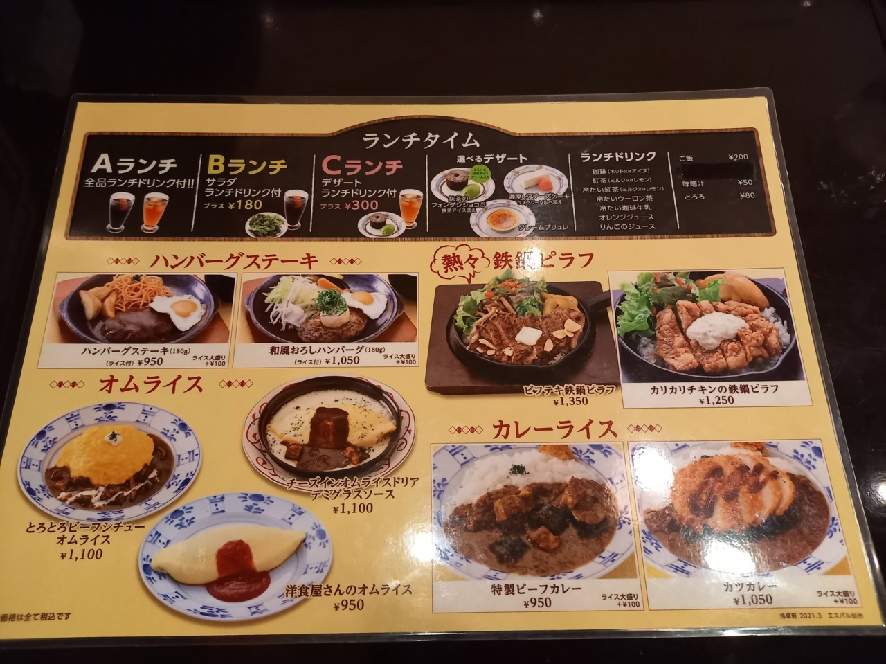 S-PAL仙台の地下一階にあります。店内は茶色を基本にしていて大人向けの内装でした。ランチはハンバーグステーキなど950円からあります。全てにドリンクが付きます。今回は洋食屋さんのオムライス950円をいただきました。色がちょっと冷めた感じですが、味は普通でした。ケチャップが結構、酸っぱいです。とろとろビーフシチューのオムライス美味しそうでした。