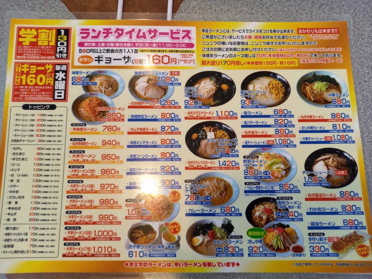 佐沼高校の近くにあります。ランチ時は餃子が半額の160円でいただけます。麺は太麺か細麺が選べます。ライスとお新香が無料でいただけます。人気のメニューは、味噌ラーメン系全般で、今回は普通の味噌ラーメン680円とライス、お新香をいただきました。何も言わなければニンニクが入ってきます。味噌味は濃厚でした。割スープで薄める事が出来て良かったです。ライスは最後雑炊でいただきました。美味しかったです。