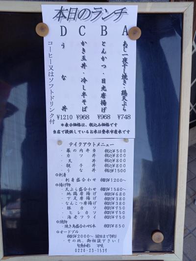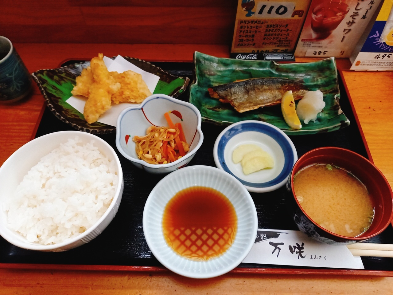 登米市民病院の近くにあります。お昼時、駐車場が結構混んでいましが、店の中はそうでもありませんでした。通常の定食は990円のそば定食から1958円の刺身天婦羅がつく万咲定食まであります。半うどんのセットメニューは1300円前後です。ランチは四種類でした。今回はAランチの鯵の一夜干しと鶏天婦羅748円をいただきました。定食の彩り良いです。鯵も鶏天も美味しかったです。ドリンクサービスで10種類から選べます。お得です。