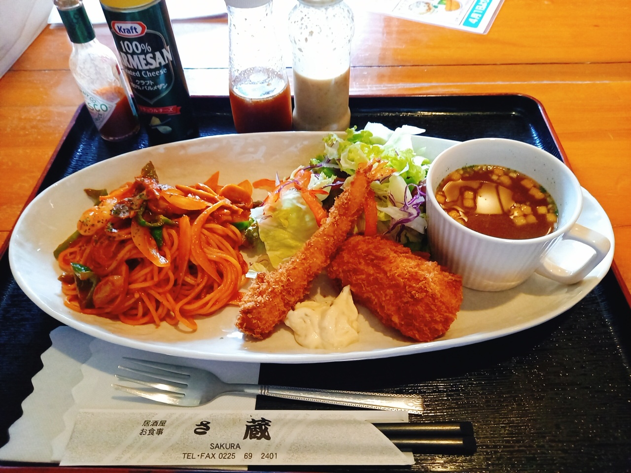 横山不動尊の近くにあります。駐車場は横山不動尊のも兼ねています。店内はカウンター5席、テーブル30席位です。和風で落ち着いた感じのお店です。ランチは550円のざるそばから天婦羅、刺身の付いた1490円の「さ蔵定食」まであります。単品だと800円前後のメニューが多いです。今回はナポリタンプレート950円をいただきました。ナポリタンにコロッケと海老フライ、サラダが付いています。ナポリタンの麺は細麺でした。海老フライは思ったより細身、カニクリームコロッケはサクサクトロトロで美味しかったです。