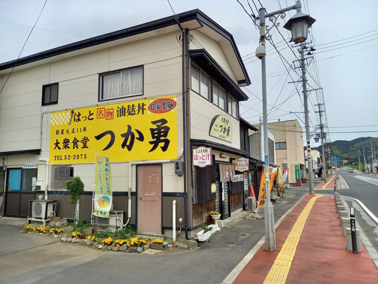 道の駅「遠山之里」とよま観光物産センターの道路挟んだ向かえにあります。つか勇と書かれた大きな看板が目印です。あぶらふ丼やはっと汁の登米市の郷土料理がいただけます。今回は、その両方ともいただけるCセット700円をいただきました。あぶらふ丼は思っていたより小さかったです。紅ショウガが合います。はっと汁のはっとは、薄くて食べやすく、美味しかったです。