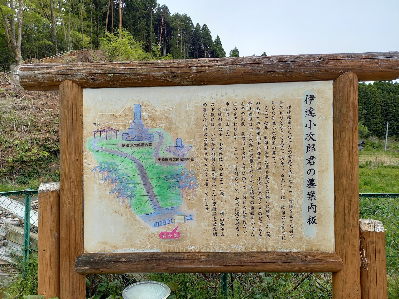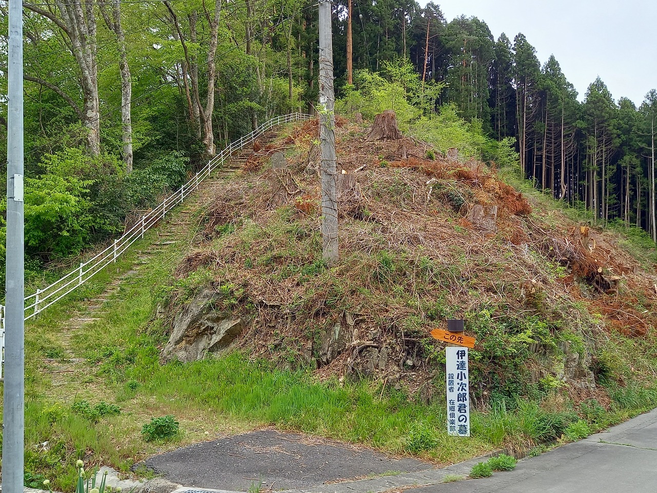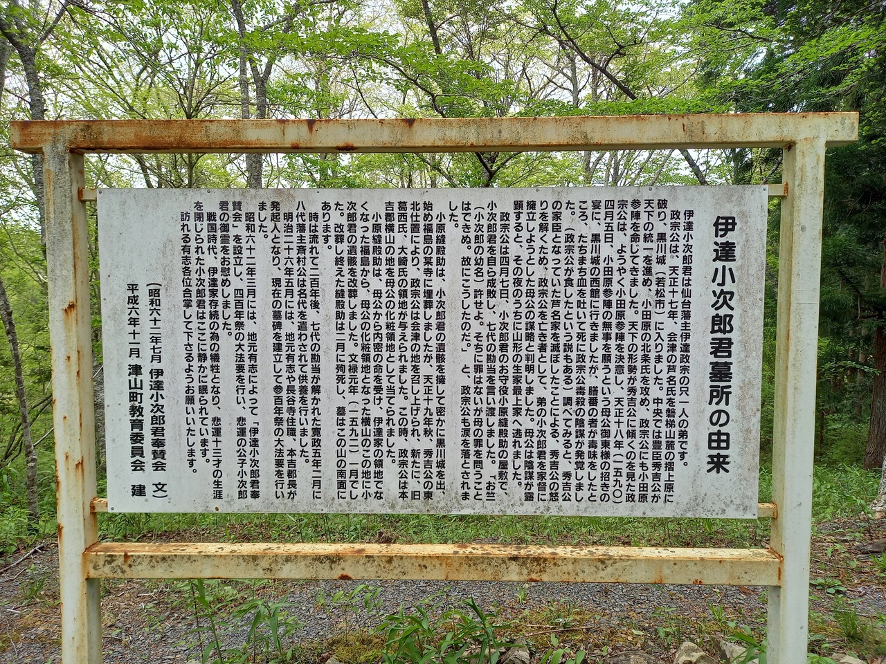 旧津山町から旧北上町に行く県道を国道45号線から1.5キロ位行った所にあります。場所は小高い丘の上です。駐車場もあり、駐車場には説明板もあります。伊達小次郎は、伊達政宗の実弟で、政宗を毒殺しようと企てた母の身代りに処罰された悲運の弟でした。小次郎の遺体は、当時、伊達家の領地であった福島県内の寺に埋葬されましたが、後の国替えによって、津山町横山の地を母の化粧領地と定めた際に、改葬され今に至ります。