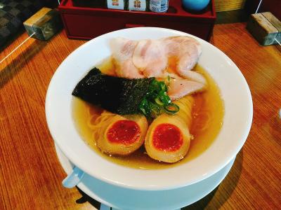 五橋の南側、荒町商店街にあります。土曜のお昼時でしたが13人待ちでした。店の回転はあまり早くないです。店内はカウンターのみ12席です。メニューは、大きく追いサバ節そばと白ふじそばに別れます。白ふじそばは730円から追いサバ節そばは830円からあります。今回は味たま白ふじそば850円をいただきました。麺は極細、スープはあっさり、チャーシューは超薄切りで柔らかでした。