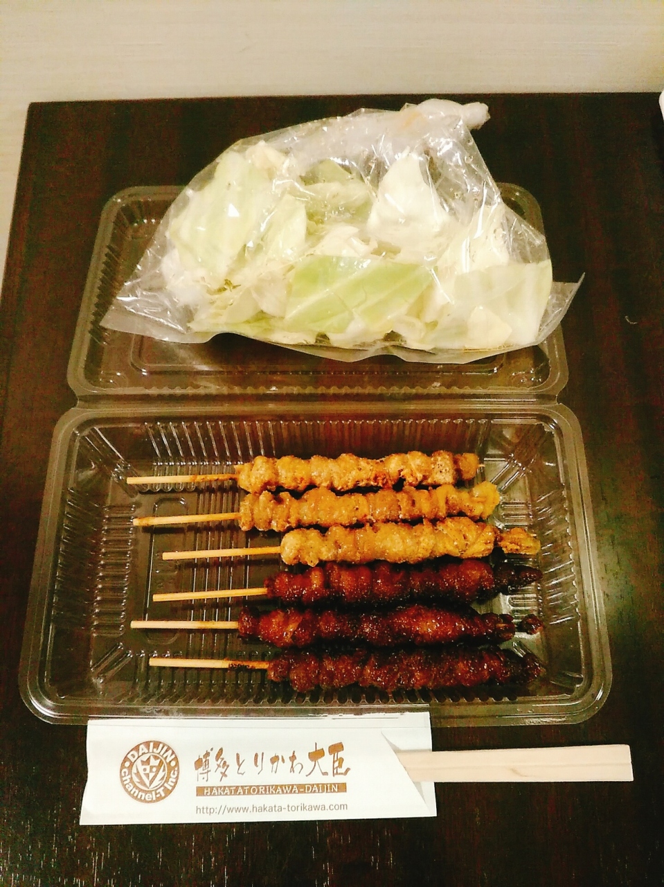博多駅前4丁目交差点近くにあります。名前の通り、とりかわ109円がお奨めのお店です。今回はとりかわの塩、タレを持ち帰りにしました。持ち帰って食べて見ると、塩はぱりぱり、タレはうまぐにゅっとでした。持ち帰りにも、嬉しいことに、酢だれキャベツ付いて来ました。
