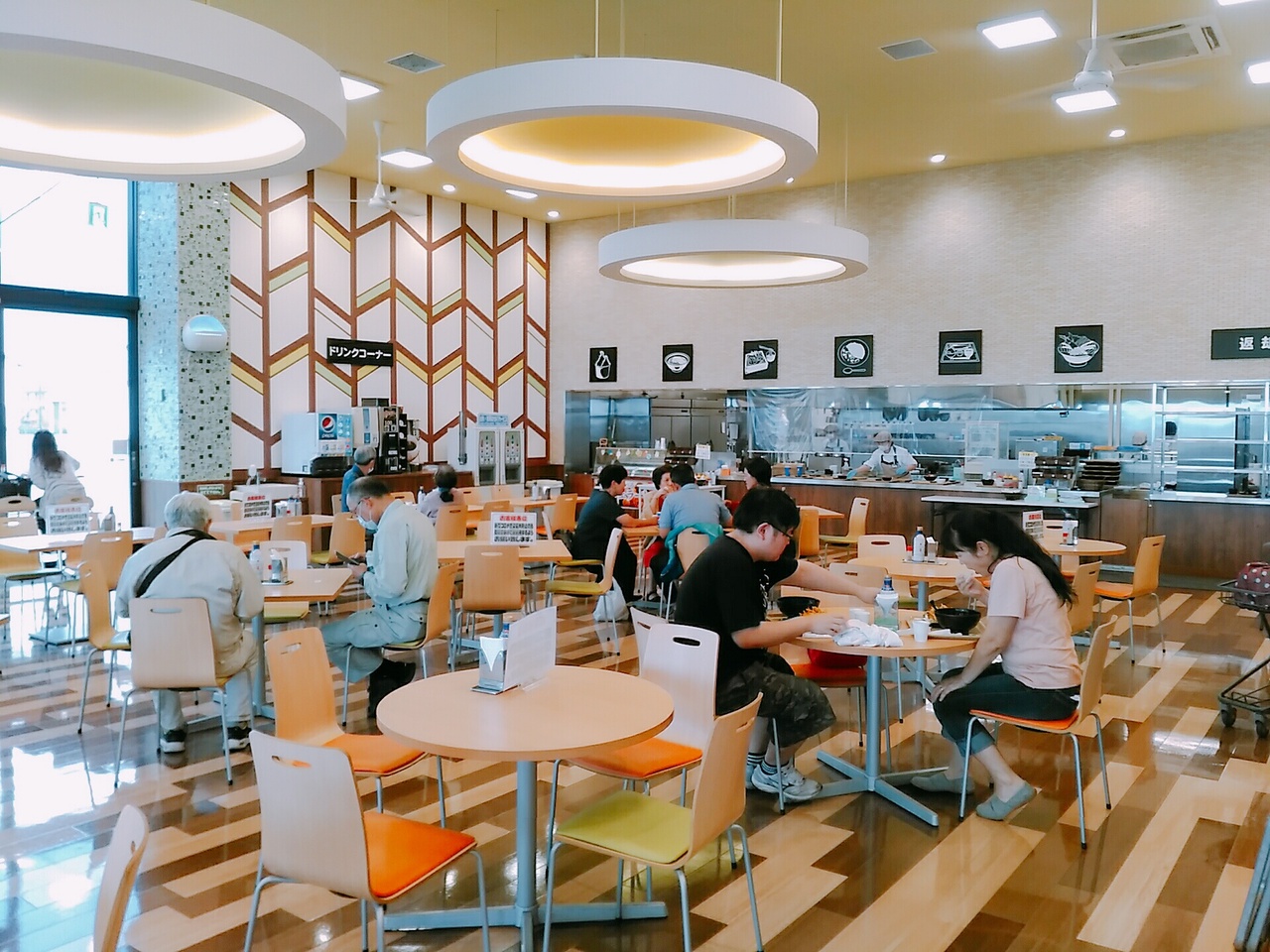 スーパーマーケット内に明るくきれいなフードコートがあります。