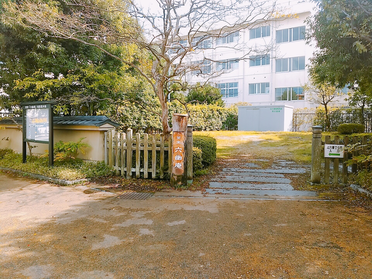 北六番丁公園の中にあり、和室2間、小間が一つと立礼席があります。建物は木造平屋建てで、今の建物は1991年に建て直されたものです。