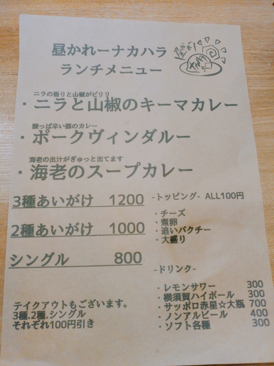 もう終わってしまいましたが、昼は、カレーのナカハラとして営業していました。
