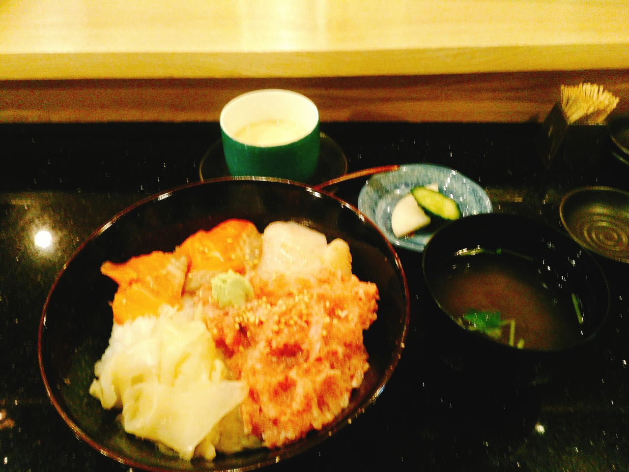 定禅寺通り近くにあります。お昼過ぎに行きましたが、2割位の入りでした。ランチのメニューは握りが1100円からと高めです。今回は、サービス丼の三色丼850円をいただきました。三色は、サーモンとネギのないネギトロ、ホタテでした。酢飯は温かく、ちょっと水分が多く残念でした。
