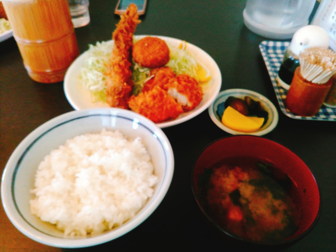 三本木の競馬の場外馬券売り場近くにあります。ランチメニューは特にありません。一番手頃なものとしては玉子丼545円もあります。今回は、ミックス定食の竹(エビ、チキン、コロッケ)910円をいただきました。コロッケは可愛い大きさで、その分エビフライがカバーしていました。キャベツは山盛りで食べごたえがあります。