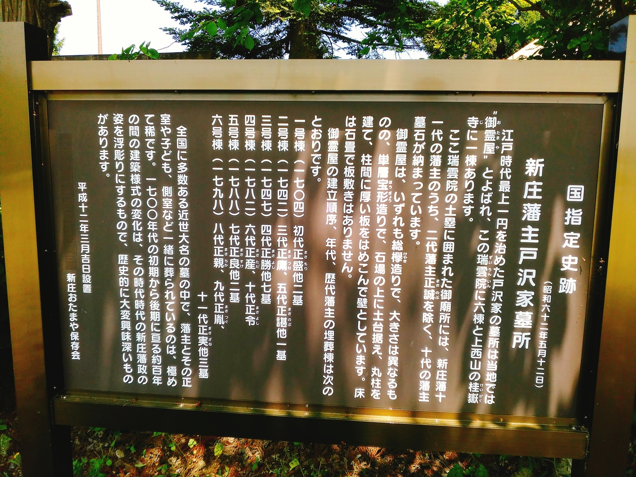 新庄駅から北に、二キロ位行った瑞雲院にあります。新庄藩歴代藩主の墓所はここ新庄市瑞雲院と桂嶽寺の2ヶ所にあります。墓所は茅葺き総けやき造りで六棟あります。周りは田んぼで静かな所なので、新庄藩主と一緒に埋葬されている家族もゆっくり休んでいると思います。
