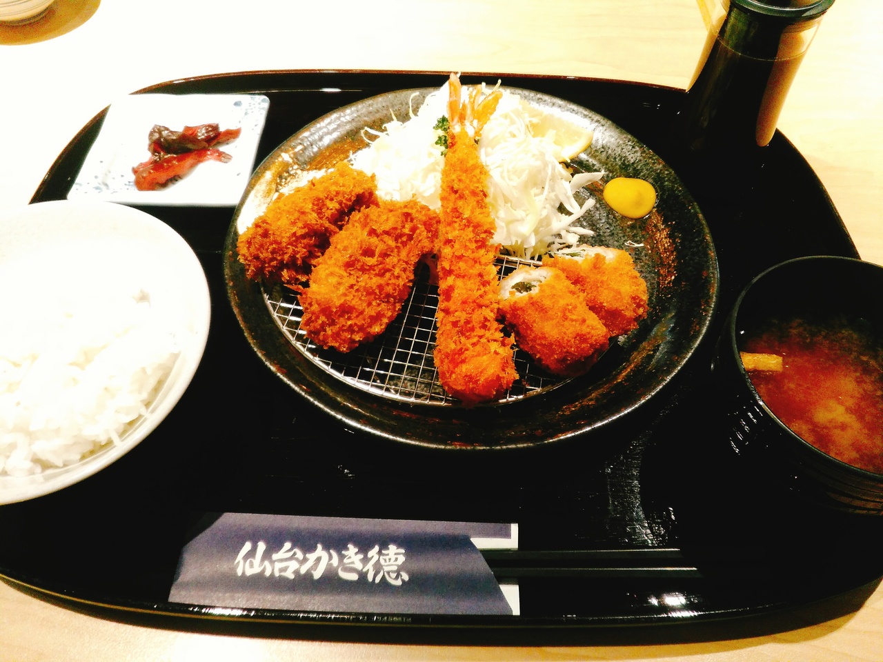 一番町アーケード街のビル5階にあります。客層は年輩の人が多いです。カキフライ定食は三個で864円(税込以下同じ)と高めです。今回は、おすすめメニューの春のミックス定食1080円にしました。フライはサクサクでしたが、揚げすぎ感もあります。そのせいか、カキフライはあまりジューシーではありませんでした。