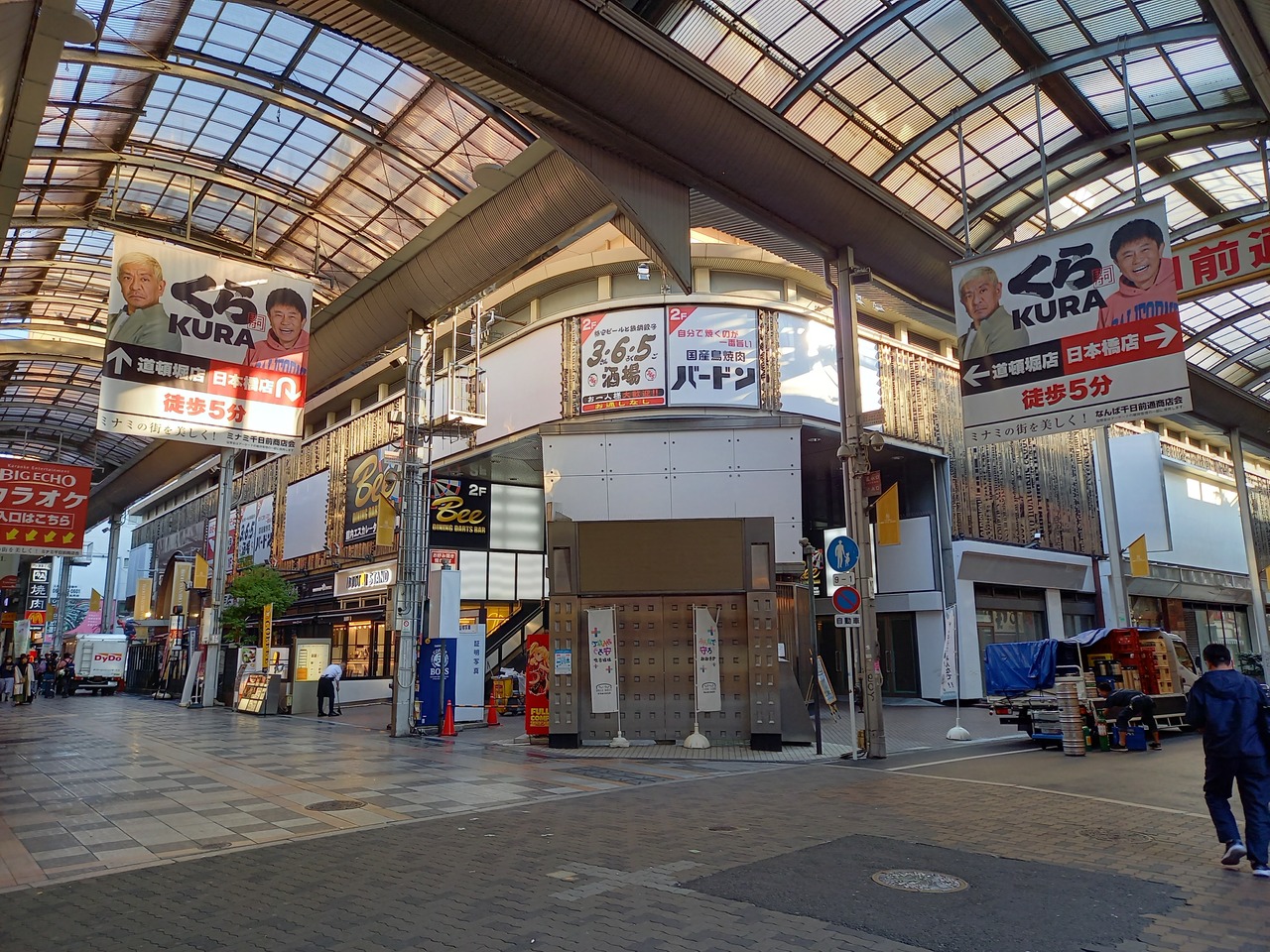 南海なんば駅の東側、なんば南海商店街出た所にあります。ダウンタウンのくら寿司の看板が目印です。