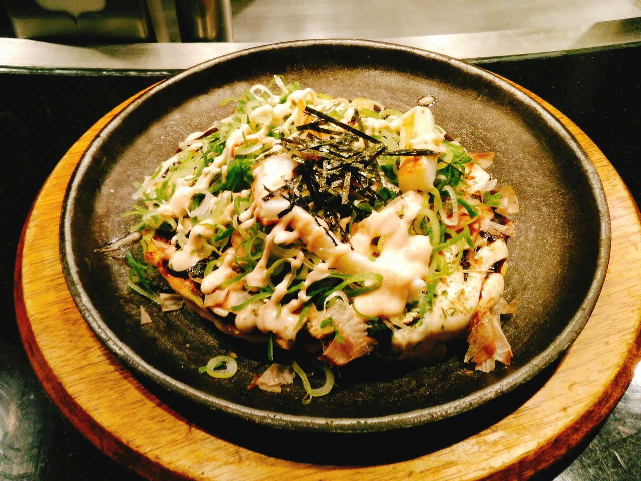 一番町のビル3階にあります。カウンター6席、テーブル30席位です。大阪のお好み焼のお店ですが、メニューには広島風もありました。値段は思ってたよりちょっと高めでした。今回は、カウンターに座り、どっさりねぎの明太いか玉960円(税抜)をいただきました。出て来るまで、20分位でした。どっさりねぎの明太いか玉は、明太子の味濃いめで、具が少ないせいか生地は食べていると飽きが来る感じでした。お昼でしたがクレジットカード使えました。