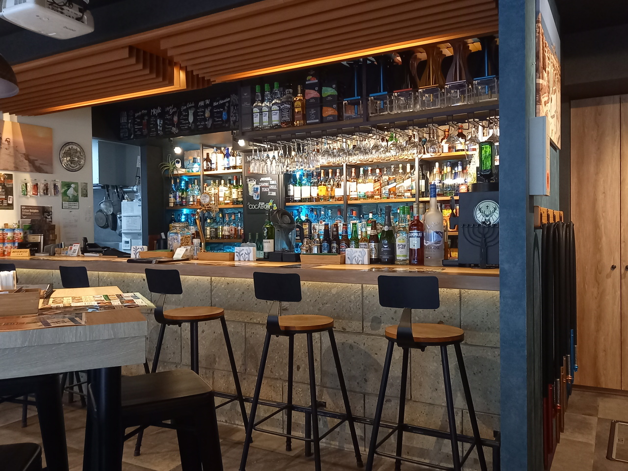 クリスロード商店街のビルの2階にあります。1階はエックスシングスです。店内は、カウンター5席、テーブル24席位です。