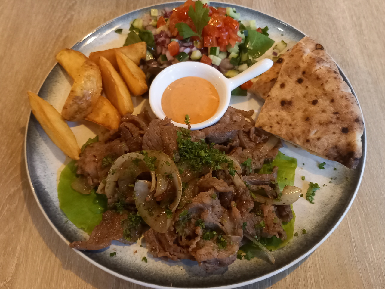 プレートにはビーフスパイス炒めとサラダ、フライドポテトがセットで、ハーフピタかライスかを選べます。