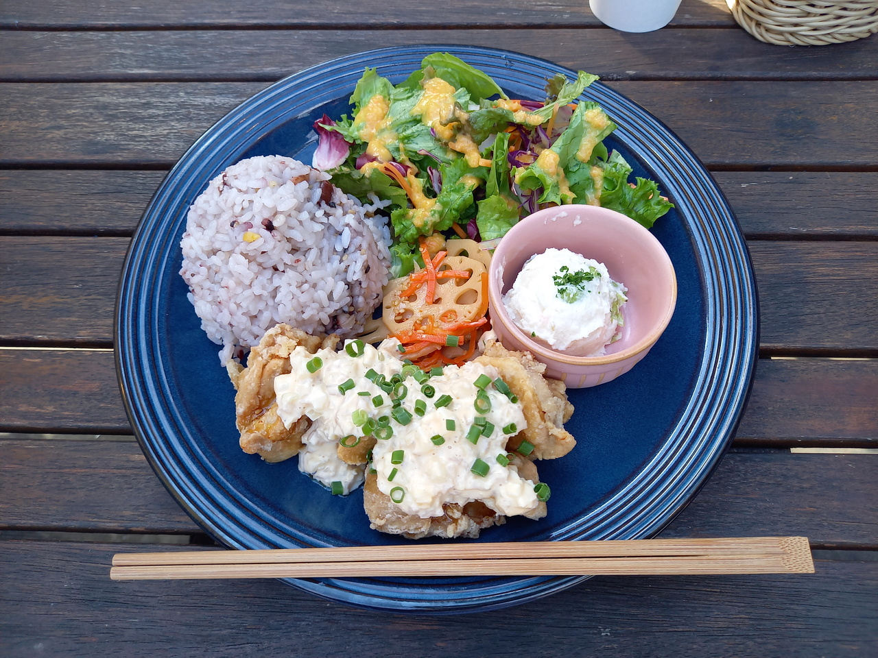 今回はプレートランチのチキン南蛮1100円にしました。彩りおしゃれです。チキン南蛮アツアツでした。