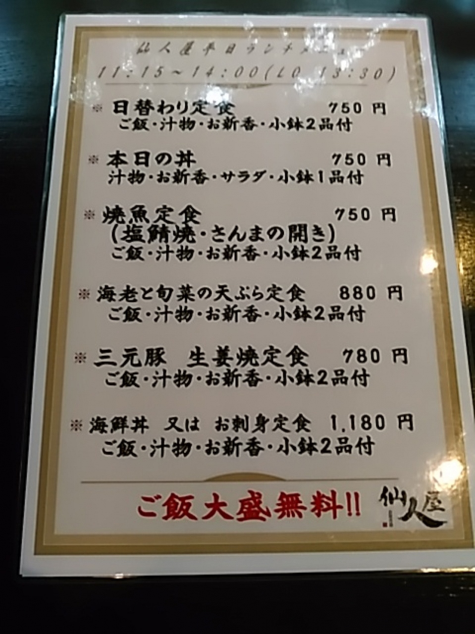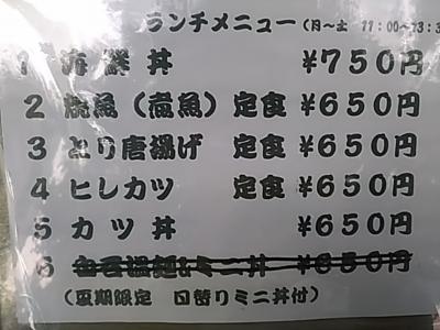 ランチは日替わり定食750円等六種類で一番高いのが海鮮丼1180円です。