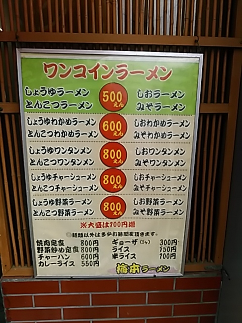 ワンコインラーメンが充実していて、味は全四種類あります。チャーシュウやワンタンがトッピングされると800円になります。