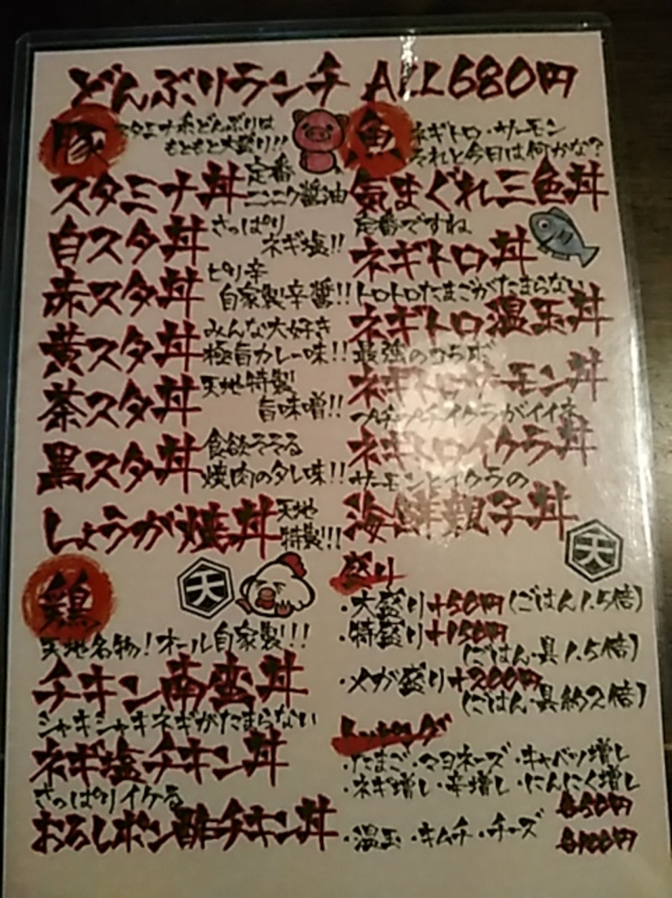 ランチは豚、鶏、魚介の丼が680円、定食ランチが780円からあります。丼のご飯1・5倍盛り(大盛り)はプラス50円、ご飯具とも1・5倍の特盛りはプラス150円、ご飯具とも2倍のメガ盛りはプラス200円です。