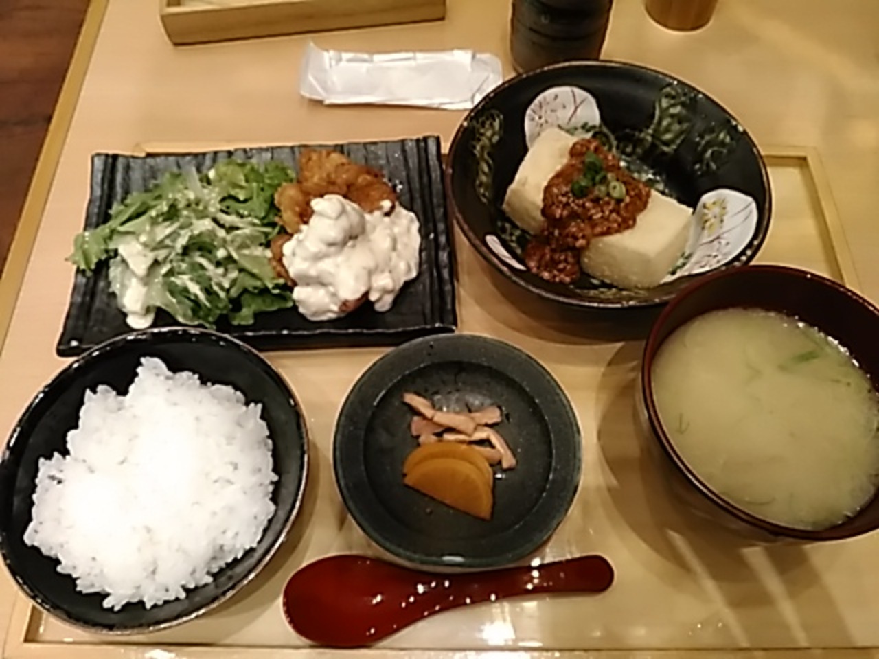 今日はお勧めの揚げ出し麻婆豆腐とチキン南蛮が付いた満腹セット930円(税別)がありました。デサートもついてこの値段で満足でした。チキン南蛮は出来立て熱々なので舌の火傷に注意です。