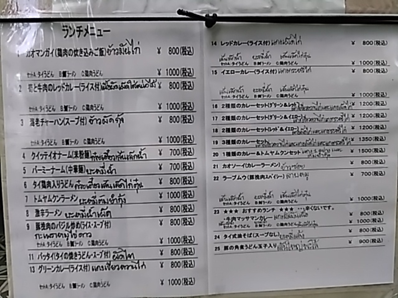 タイ料理全般が楽しめ、単品は800円位で麺・うどんのセットにすると1000円位です。全てにサラダとデサート(タピオカ)が付くようです。