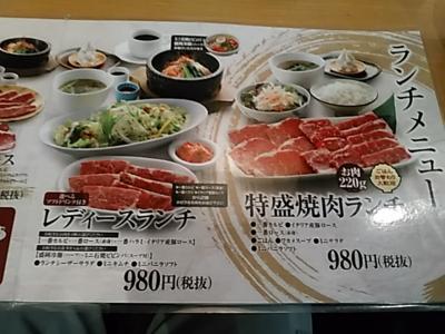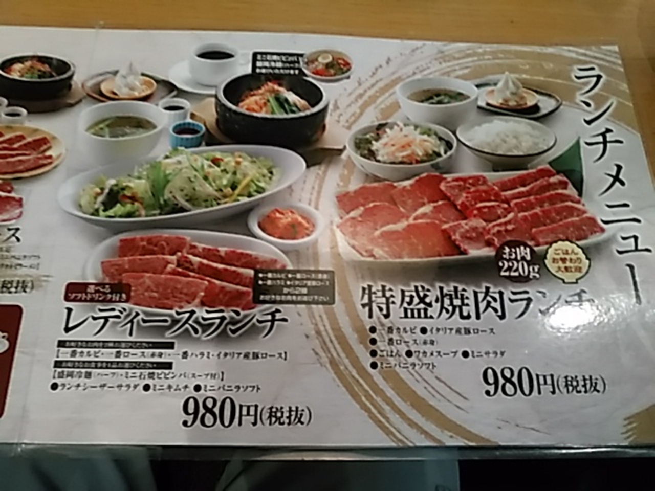 ランチは5種類で880円から1480円です。レディースランチは焼肉二種類、冷麺かビビンバどちらか、サラダとミニキムチ、ミニソフトクリーム、ソフトドリンクがついて980円です。