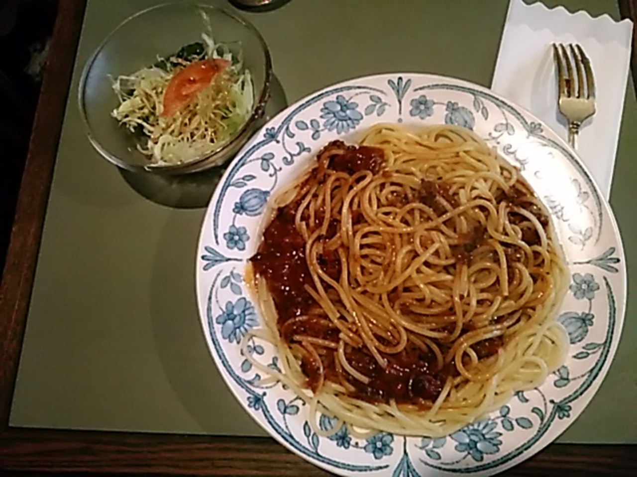 ミートソース630円にはサラダとスープが付きます。出てくる迄、あっと言う間なので、下茹でしていると思いますが、延びは気になりませんでした。ミートソースは辛くタバスコは要らない人が多いかもです。