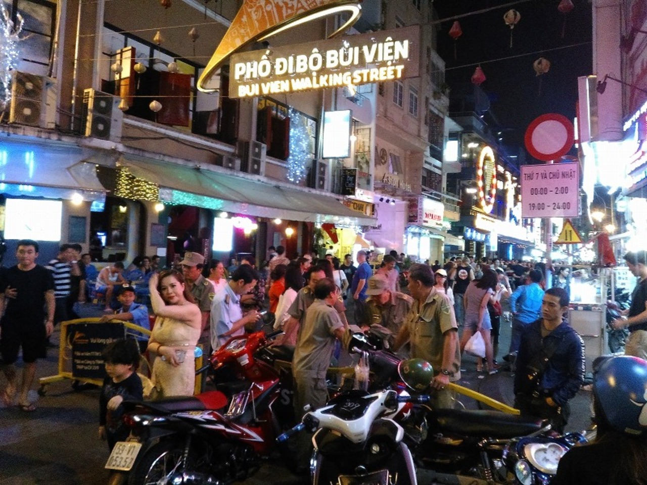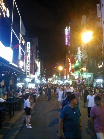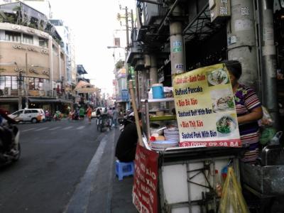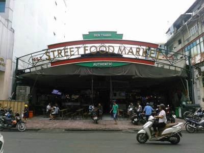 ストリートフードマーケットの場所は、ベンタイン市場の裏手を縦に通る道沿いで、レタントン通りとリートゥーチョン通りの間です。距離にして、100m位です。屋台村と行った感じで、店は50軒位あると思います。店から料理を買って、入り口付近と奥に食べるスペースがあるのでそこで食べるのですが、夜は、座る所を探すのが困る位、凄く混みます。