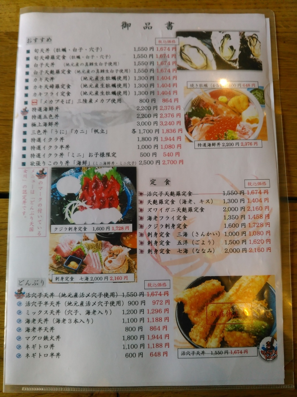 女川駅前にあるハマテラスの北側にあります。孤独のグルメ宮城県編に登場したことでも有名です。名物はどんぶりからはみ出る穴子天ですが、今は時期でないのか、休止中でした。