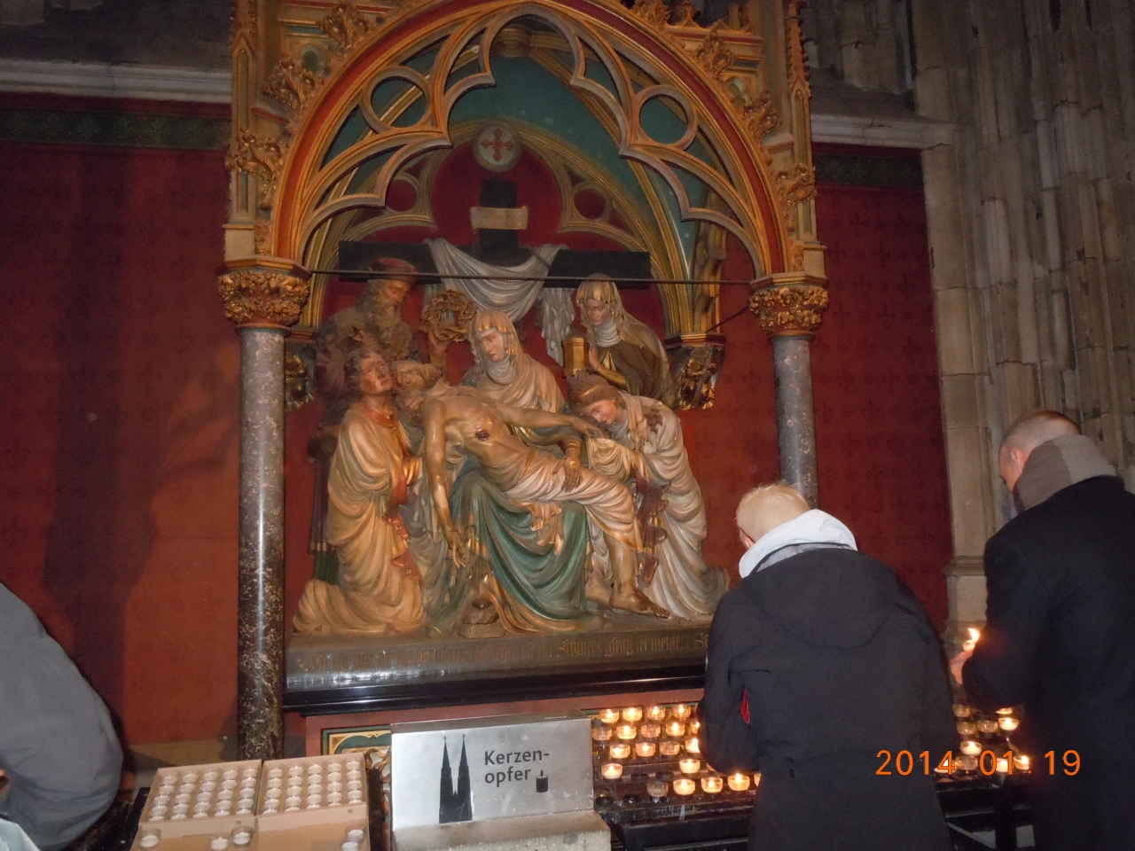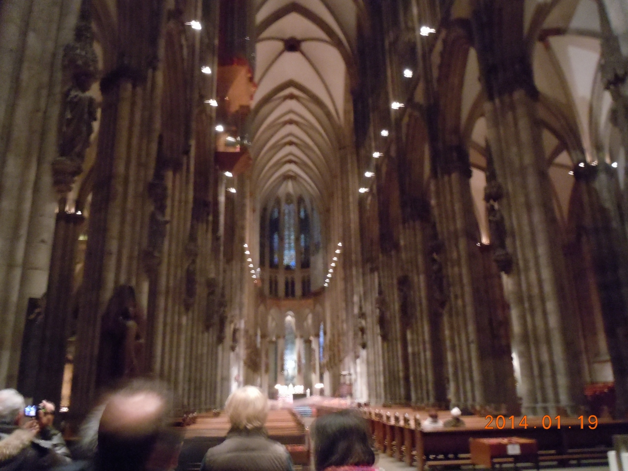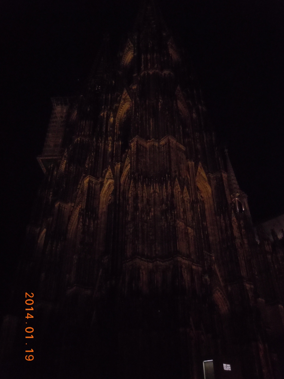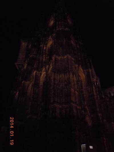 ツアー旅行で個人の自由にはならないので仕方はなかったが、ケルンの緯度は50度以北にあるため冬場の日照時間はかなり短いこともあって、我々が到着したのが17時30分頃、既に暗くなっており肉眼では大聖堂を眺めることはできたが、思い出の写真を撮るとなると暗すぎて上手く取れなかった。フラッシュを焚いても光が弱く大きな聖堂自体の記録は無理であった。ちなみにドイツ北部は曇天曇り空が多く朝は8時頃でないと明るくならないようである。その辺を承知の上で楽しく観光することを望みます。