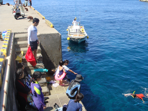 東海汽船の入る桟橋岸寄りですが、御蔵島の地元の家族等が遊泳しています。深さは5m~6m程度あり、ドルフィンスイムする人達の練習場所としても最適です。
