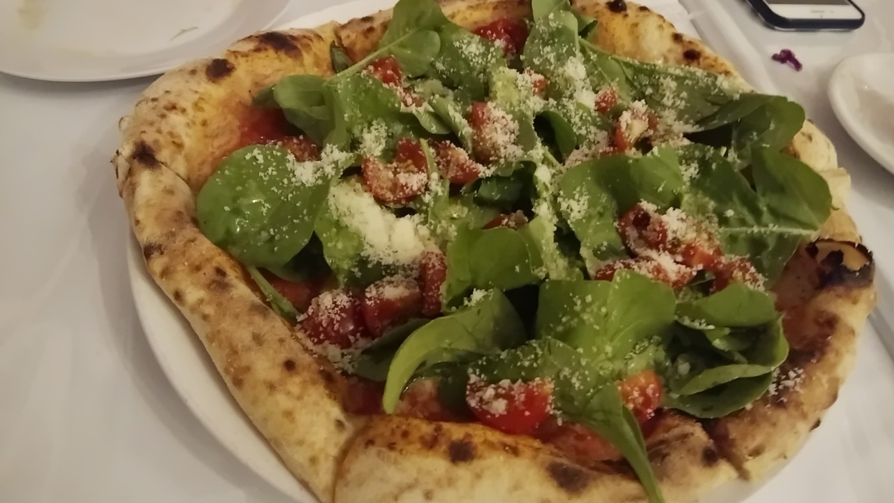 トマトとルッコラのピッツア1,000円位、キノコのピッツア1,000円位にトリフ500円位をたっぷりかけていただきました。とても美味しく、このお値段で??と思いました。このほか、シャンパンが400円、白ワインもグラスワインで400円でいただきました。どちらも美味しく素晴らしかったです。