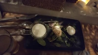 お得だと思われる4,000円のコースと、1800円のデカンタを注文しながら、のんびりと賞を取っているという美味しいお食事しながら優雅な時間を楽しもうと思っていました。が!コース料理が、次から次へと出て来てしまい、テーブルの上には、常に前に出て来た食品と次の食品とが並ぶ状態で、忙しい食事となってしまう始末。なんか、お店全体がせかせかしていて、落ち着かない感じがしましたので、デザートに辿り着いたときは息切れした感じです。