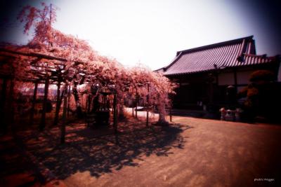 山門前には八重の紅枝垂れ桜があります。- 旅行時期