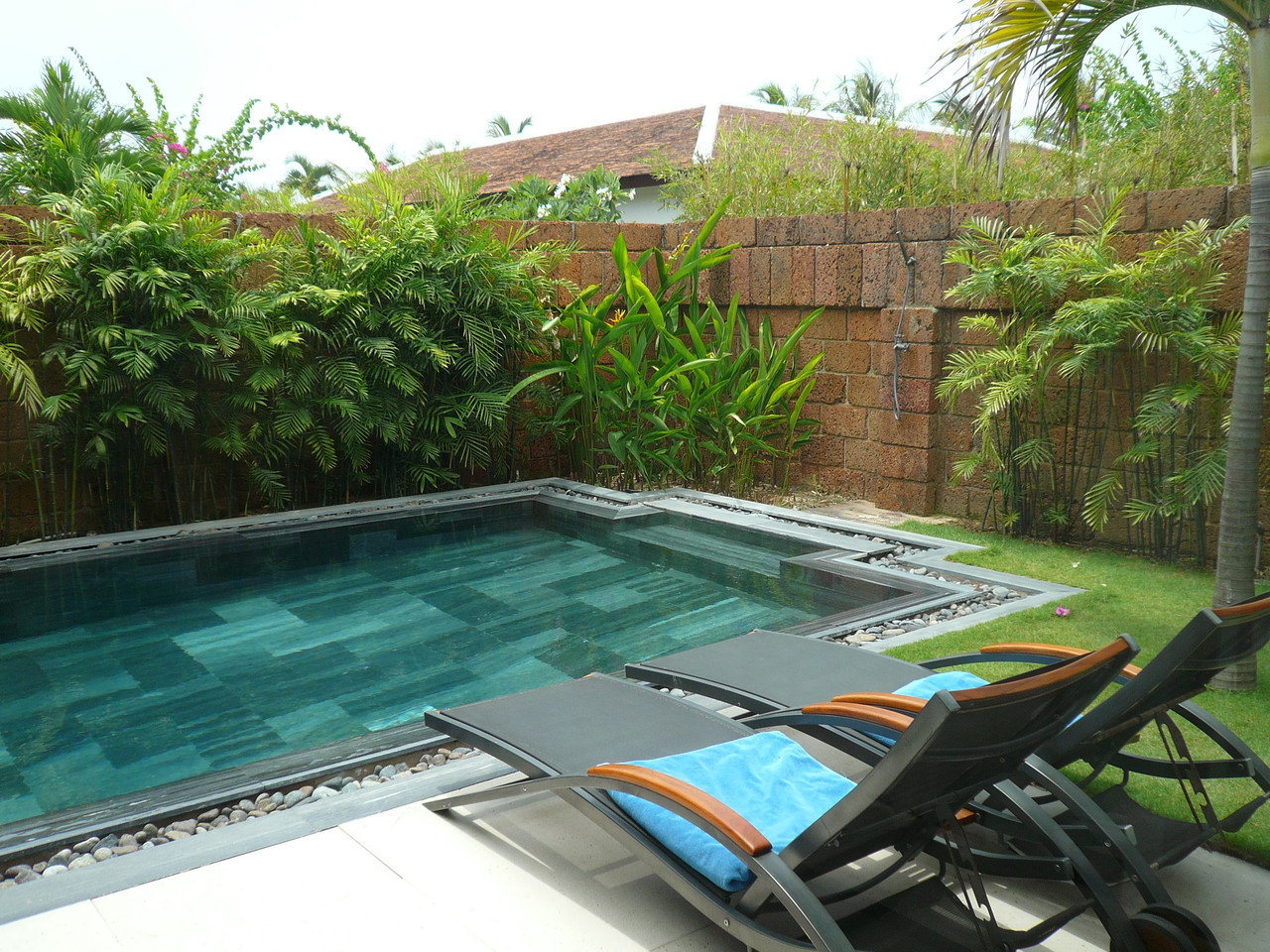 サイドでもお部屋でもOKです。部屋は広い庭に一つずつ建てられプライベートプール付き