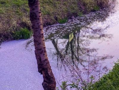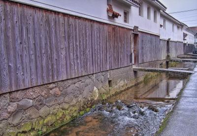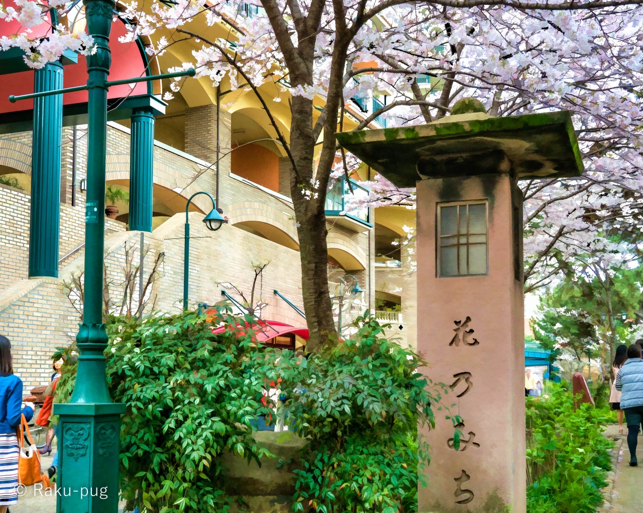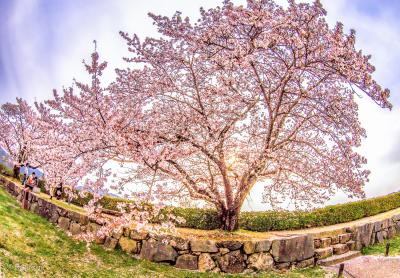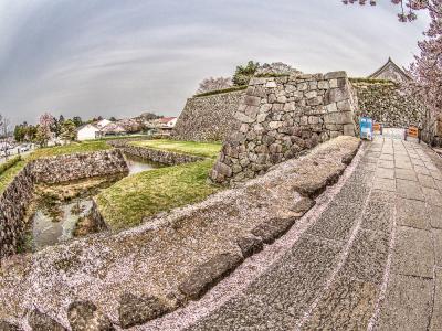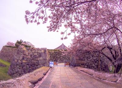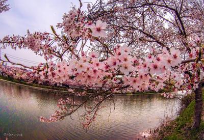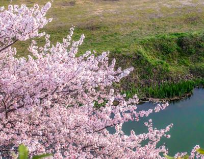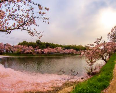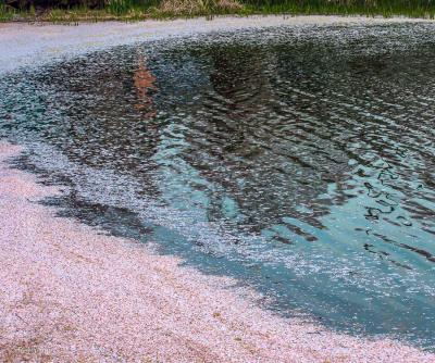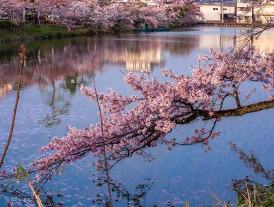 城下町に 桜の花びらが 池に 重なり合って 素敵な景色です!