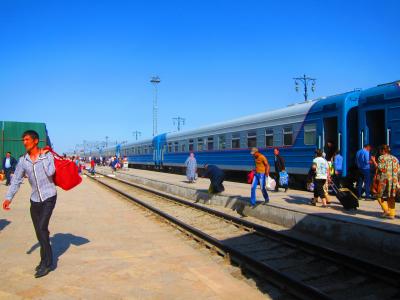 地下鉄チョルスー駅からタシケント駅に行きました。地下鉄のタシケント駅から電車の駅は少し離れています。しかも道案内もない地下のだだっ広い何もない通りを歩いていかなければいけないので、迷うというか不安です。一度外に出てしまえば簡単にたどり着くことが出来ると思います。タシケント駅は切符売り場と改札が離れているので、まず駅の隣の建物で切符を買ってから駅に入ります。駅に入るときはパスポート&荷物&切符のチェックがあり大変めんどくさいです。駅の中は売店がほとんどないので、駅の外で買ってから乗り込むのがいいと思います。