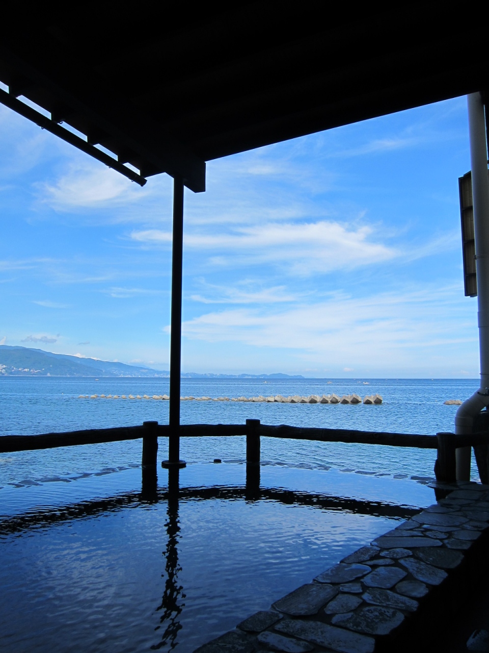 JR網代駅から海沿いに歩いて10分ぐらいのところにあるお宿でした。立ち寄り温泉可能だったのでよってみました。露天風呂が海へと突き出していて、海に入っているような感じになります。海もきれいだし温泉も開放感があって抜群のところでした。