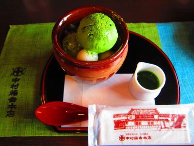 宇治に行って食べたかったのが抹茶パフェですが、抹茶のお店といえば中村藤吉です。お店はスイーツだけでなく食事もできるので、おやつ時だけでなく食事時も行列です。本店では1~2時間待ちは普通ですが、平等院店では約30分ぐらいで席に通されることがあります。