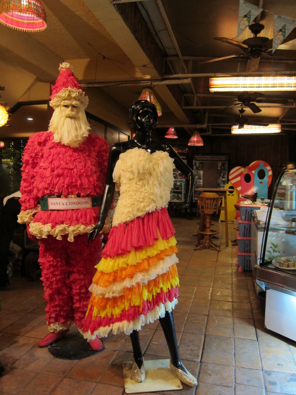 アソーク駅周辺のレストラン、キャベジズ&コンドームスは駅から徒歩約5分でわかりやすいところにあります。レストランの入り口で人数と喫煙か禁煙かを言えば広い店内の席まで案内してくれます。キャベツを買うようにコンドームを気軽に買えるようにという意味を持つ店はエイズ撲滅を目的にしていて、店内のいたるところにキャンペーンの案内やポスターがはってあります。お店のインテリアもコンドームでできたものがあります。食事もお手ごろな値段で、本格的なタイ料理から、中華料理も少しありました。会計のときにお土産でコンドームをもらいました。見た目も味もいいレストランでした。