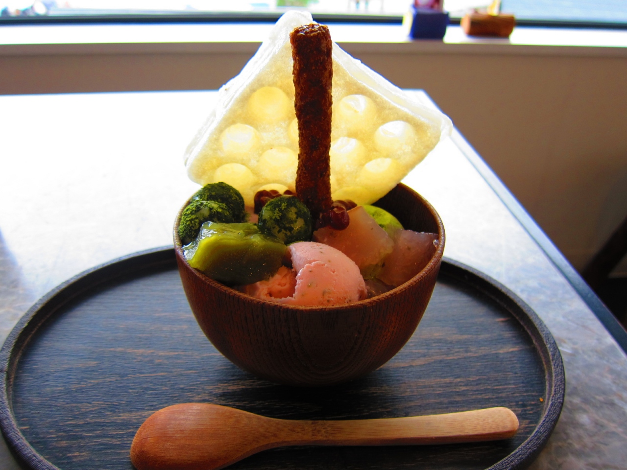 渡月橋の横にあるお土産やさんの2階にあるカフェは橋の横ということもあり、大きな窓から渡月橋をゆっくり眺めることができます。メニューも和の食材を中心としたパフェや、ランチ時になるとカレーやパスタが食べれます。季節限定のさくらパフェは1階の厨房で焼きたてのモッフルがついてきました。もっちもちでおいしかったです。