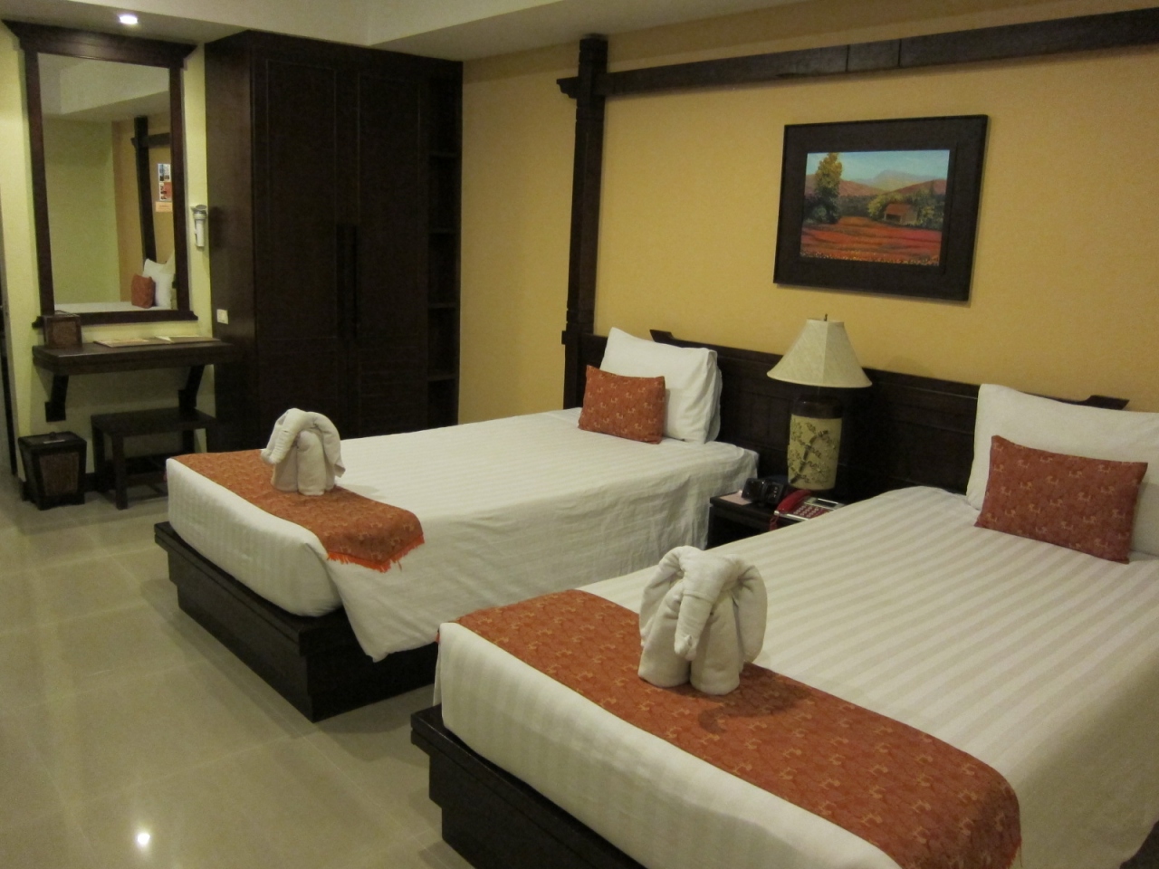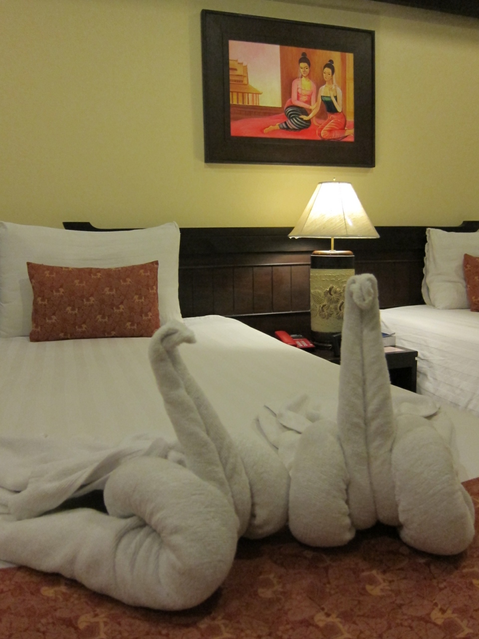 トンタホテルは部屋を空けるとベッドの上にタオルでできた動物たちがお出迎えしてくれます。2日泊まりましたが、1回目は象、2回目はスワンでした。とってもかわいいです。また、空港からの無料送迎が24時間30分おきぐらいにあるので、空港付近のビジネスホテルとして利用しました。ホテルの前にはちょっとした屋台街があるので夜遊びもできます。