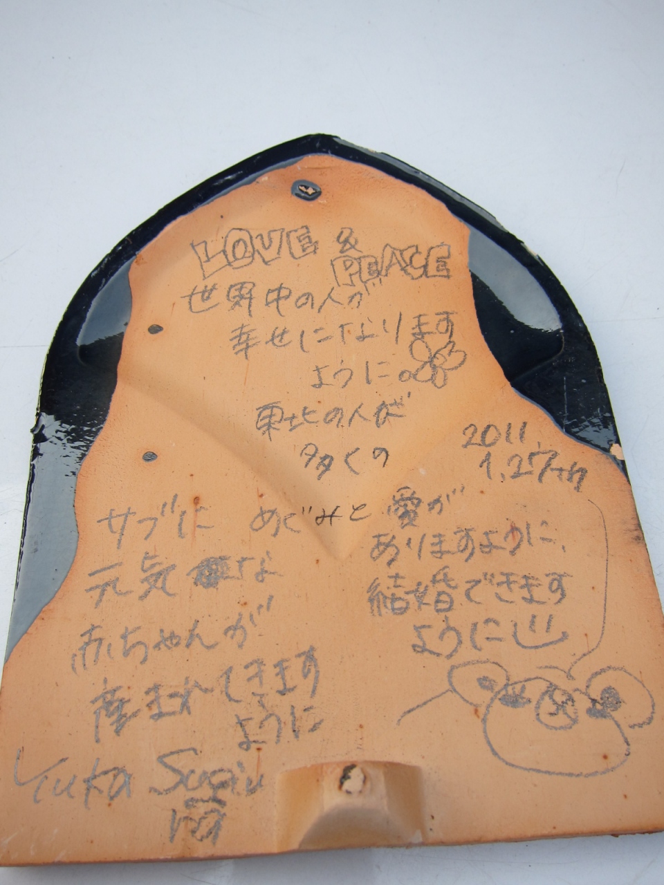 半年ぐらい前からワットポーの涅槃仏の建物のかわらの改修工事をしてます。そこに新しく使われるかわらの裏に自分の願いを書くことができます。場所は涅槃仏の建物の前にテントを広げ、かわらをいっぱい広げているので人目でわかります。ある程度の寄付をすればかわらを1枚くれるので、そこにある鉛筆でかわらに落書きをすることができます。たいていの人は願い事を書くそうです。自分の書いたかわらが後々ワットポーのかわらになるのでいい記念になること間違いなしです。