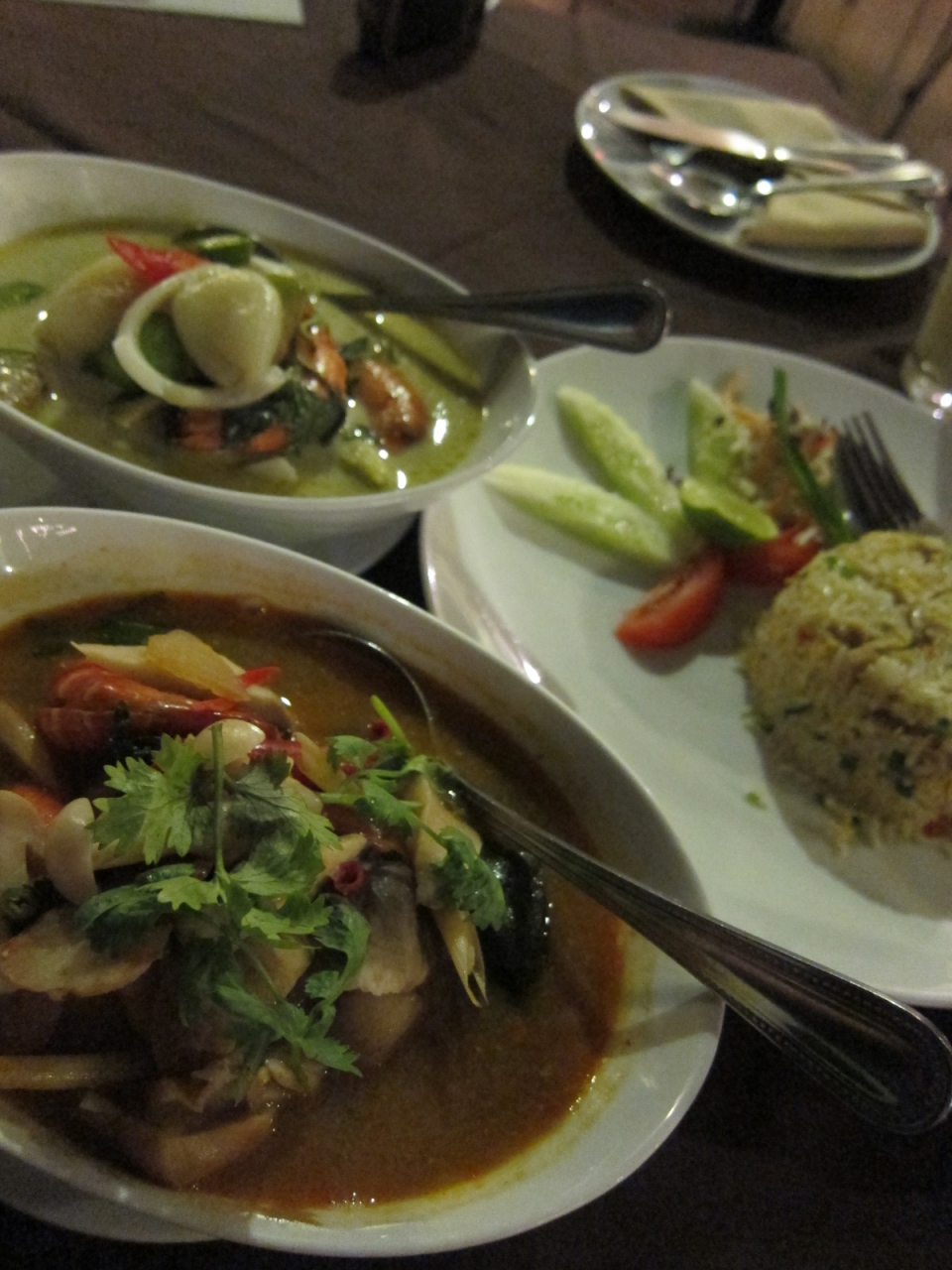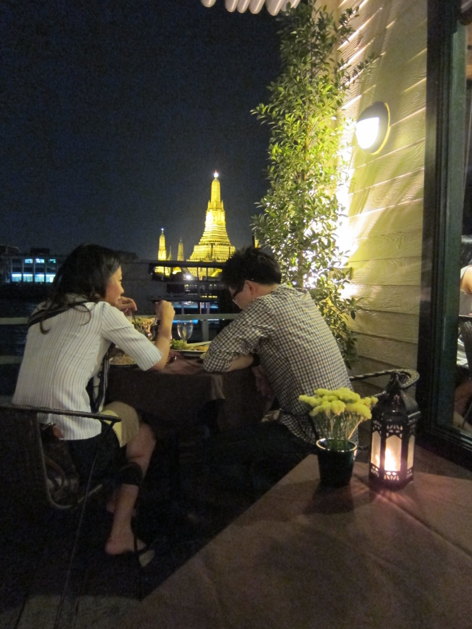 ワットポーの前にある、ワットアルンが目前に見えるレストラン、ザ・デッキ。夜に行くとライトアップしたワットアルンが一望できます。値段も川沿いのほかのレストランに比べてリーズナブルで、でもおいしい。トムヤンクンやグリーンカレーのえびも大きくってプリップリ、おいしかったです。夜の川沿いの席に座りたければ、予約は必至です。夜は帰りが8時以降になるとボートがなくなるので気をつけてください。