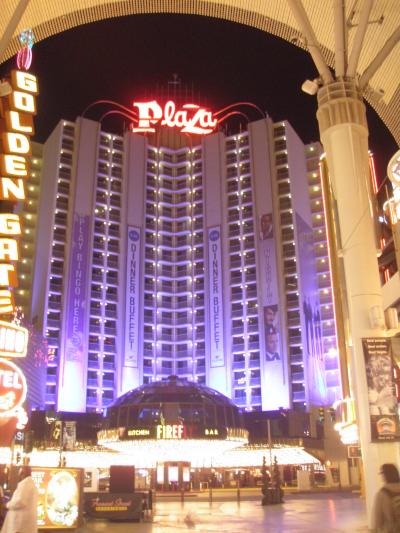 ラスベガス・ダウンタウンにある格安ホテルです。映画バック・トゥー・ザ・フューチャーの撮影場所としてもしられるプラザホテルは1泊約2000円で宿泊できます。ホテルの目の前にはダウンタウンのアーケードがあるので、ショーのときはホテルから見れます。また、グレイハウンドバスのバス停の隣なので、バスが深夜着便でも安心してホテルまで着くことができました。