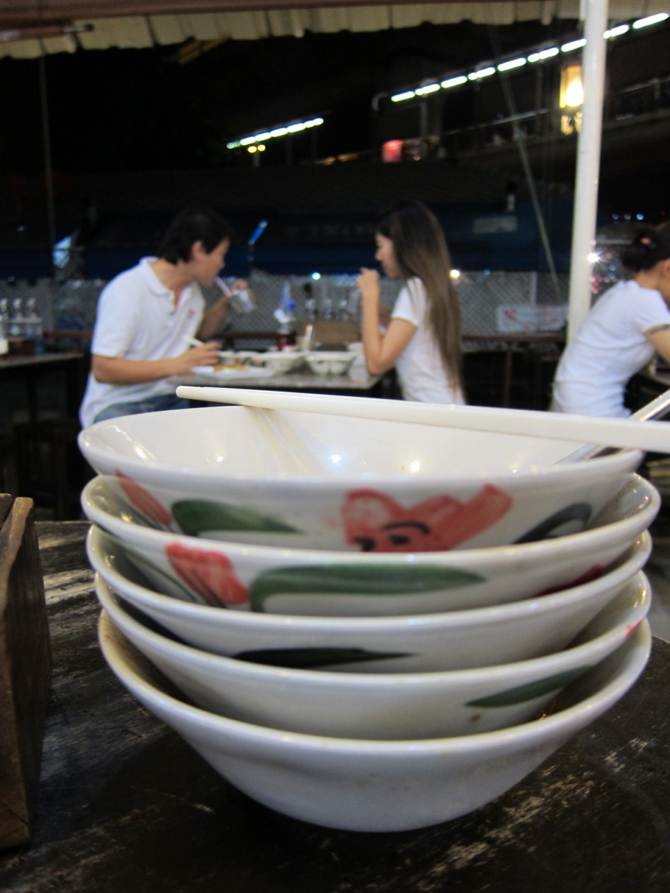 バンコクBTSのスクンビット線上のビクトリアル・モニュメント駅横の屋台の中にバンコク版わんこそば屋があります。従業員に日本語は通じないけど、写真入のメニューを持ってきてくれます。1杯B10で小盛りのどんぶりできます。麵は太いのから細いの、卵麵。スープのあり・なしを組み合わせると何通りにもなります。ここでの一番の人気は牛の血の入ったスープ。そんなに癖もなくさらっといけます。バンコクの人は食べ終えたお皿を積み上げて、本当にわんこそばさながらでした。みなさん、一度お試しあれ。
