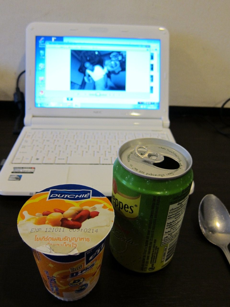 前回タイに来たときに、あまりの不自然さにおどろいたけど、この組合せ、意外にもいけます。タイの人にとってコーンと豆はフルーツにもなるらしく、ヨーグルトの中にも入っています。どこの国に旅行してもヨーグルトは必ず食べるほど大好きですが、初めてタイでこの味に出会いました。初めて見たときは衝撃的だったけど、コーンが口の中でプチプチして、おいしいです。はまります。スーパーならどこでもあるし、B15ぐらいでお得なので、一度試してみてください。